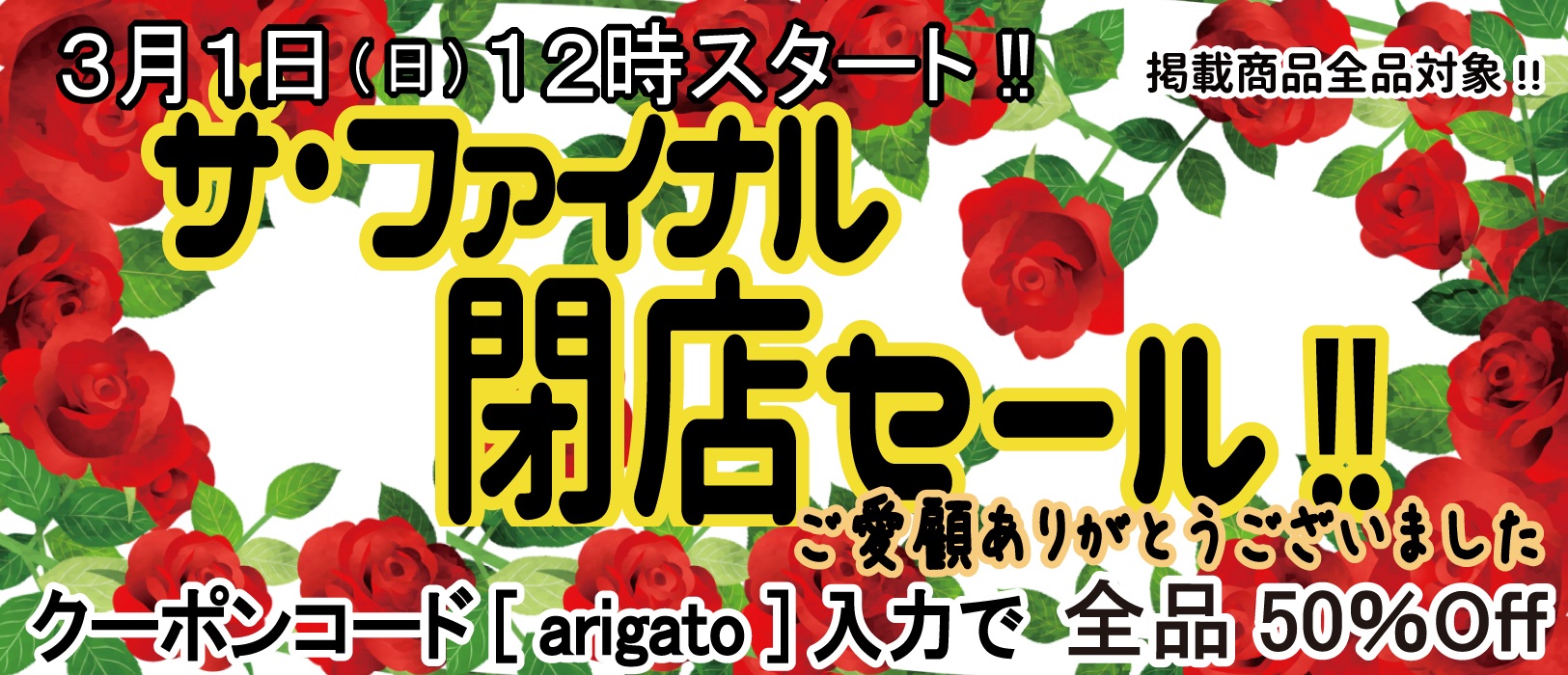 閉店までの間、これまでのご利用に感謝の意を込め、全品半額の閉店セールを開催しています。